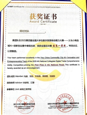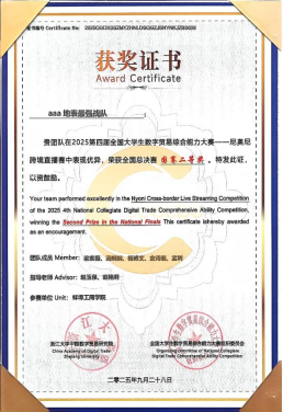 大赛由浙江大学中国数字贸易研究院创办,全国31个省、市、自治区的33所高校联合承办。本届大赛自2025年1月启动,经过前期初赛、省赛,我校共有2支团队入围“义乌小商城AI+创新创业赛”和“尼奥尼跨境直播赛”两个赛道的全国总决赛,与来自吉林大学、武汉大学、南京财经大学等全国多所高校的优秀队伍同场竞技,分别获得全国一等奖和二等奖。