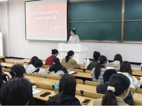 2025年10月22日下午,由蚌埠工商学院创业学院主办、国际商务学院承办、国际贸易协会协办的2025年安徽省大学生服务外包创新创业大赛校内选拔赛在笃行楼A102正式举行。