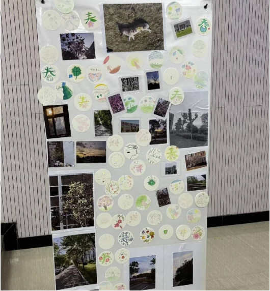 活动现场氛围热烈,同学们手持彩笔,在白色小圆纸上精心勾勒眼中的春日校园,抽芽嫩枝、盛放春花等元素跃然纸上,每幅作品都承载着对春景的喜爱与对自然的热爱。大家小心翼翼地将手绘画作及春日校园照片粘贴在展板上,零散创意汇聚成一幅完整的春日画卷,为活动画上温暖句号。